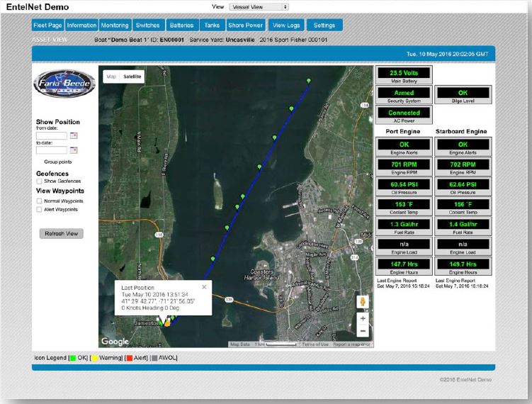 The proprietary ruggedized hardware solution is fitted on-board each boat – where it interfaces with various marine (can monitor up to 4 engines) turn/on off on-board systems (remote switching of up to 3 systems), and monitors other sensors/senders (batteries, bilge pumps, high water sensors, temperature and shore power sensors). The 50-channel GPS provides for high-resolution tracking (as fast as once a minute) and geo-fencing capabilities. The on-board accelerator enables programmable dock and anchor drag detections and alerting.